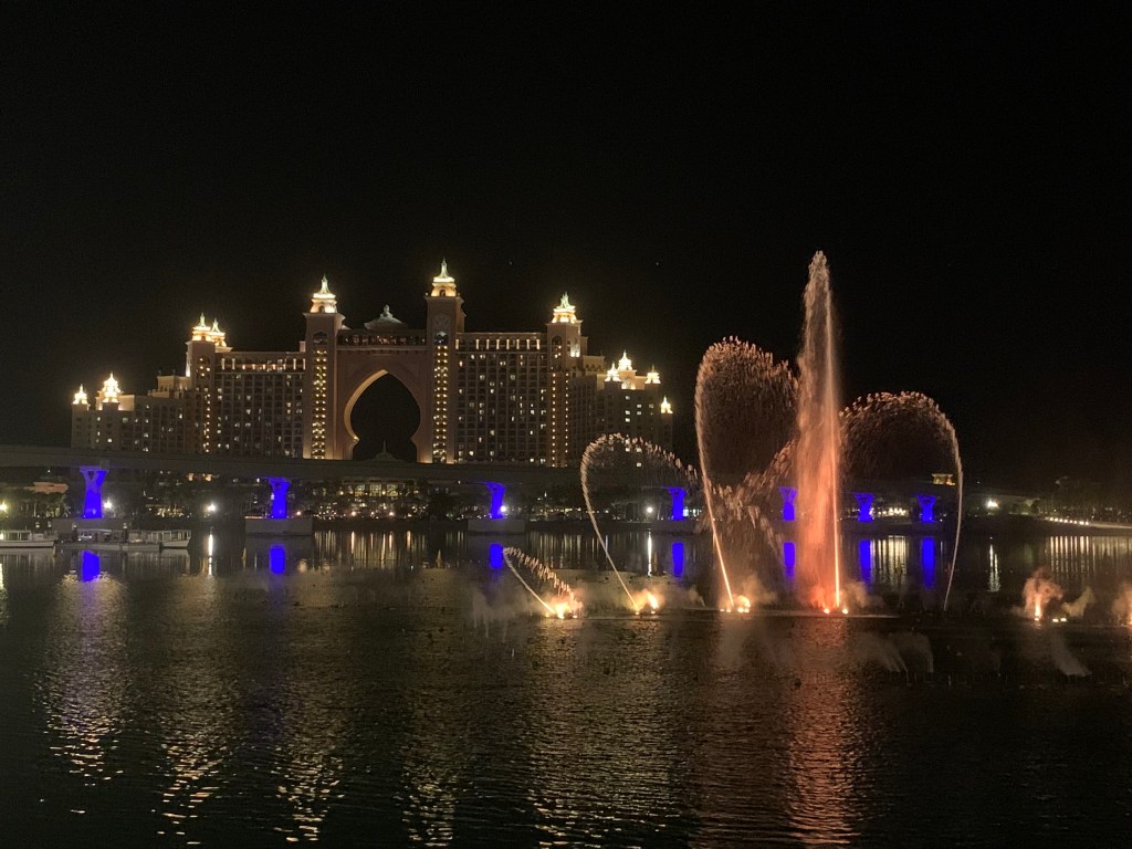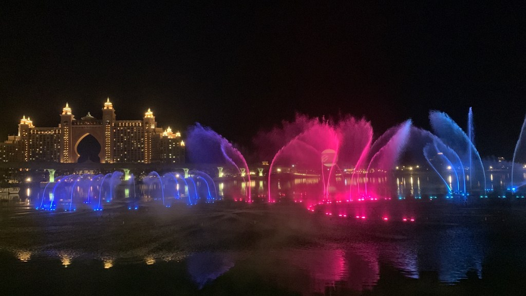 … dank der Lage hatten wir auch eine perfekte Aussicht auf das Luxushotel Atlantis und die Wasserspiele davor. Ich könnte mir diese unglaublich gut gemachten Wasserspiele zu den verschiedensten Musikstücken einfach stundenlang anschauen.