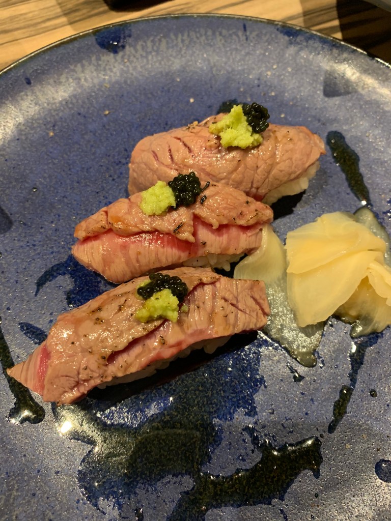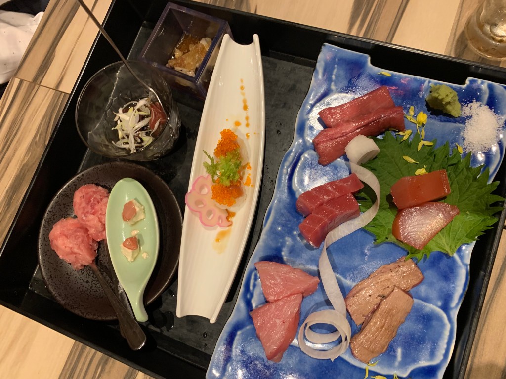 Zum Abendessen waren wir auf besonderen Wunsch von zwei Reiseteilnehmern auf der Suche nach einem Sushi-Restaurant, das im besten Fall für die anderen – weniger Sushi-begeisterten – Mitreisenden auch Alternativen im Angebot hatte. Und zu unseren großen Freude und Überraschung wurden wir tatsächlich fündig. (Warum das keineswegs selbstverständlich war, dazu in einem anderen Beitrag mehr.) Eine Sushi-Sashimi-Nigiri-Platte für die einen, Rindfleisch-„Sushi“ und gegrilltes Hühnchen für die anderen. Alles sehr lecker. 🙂