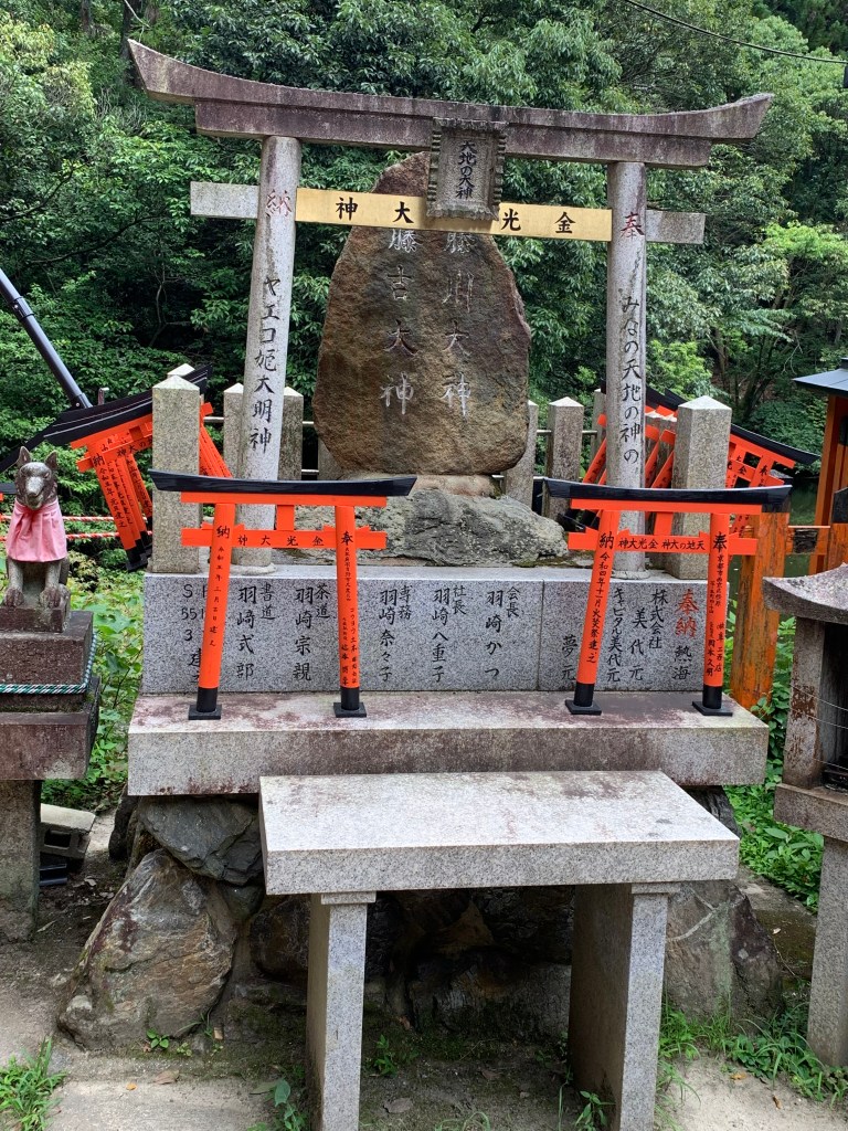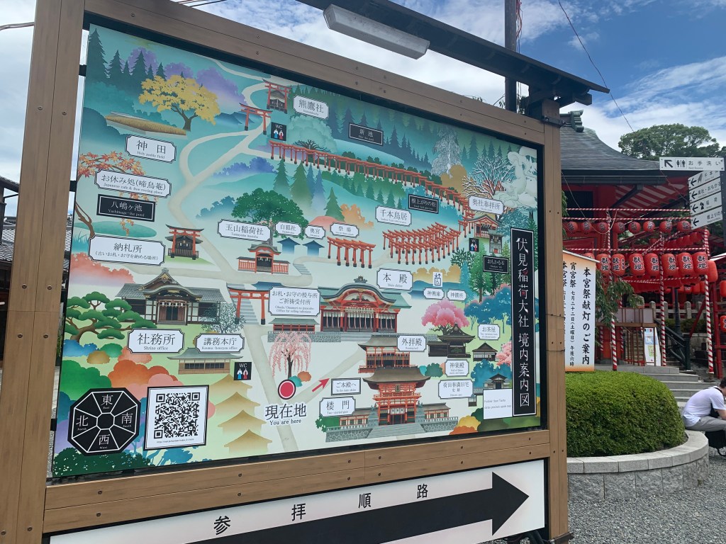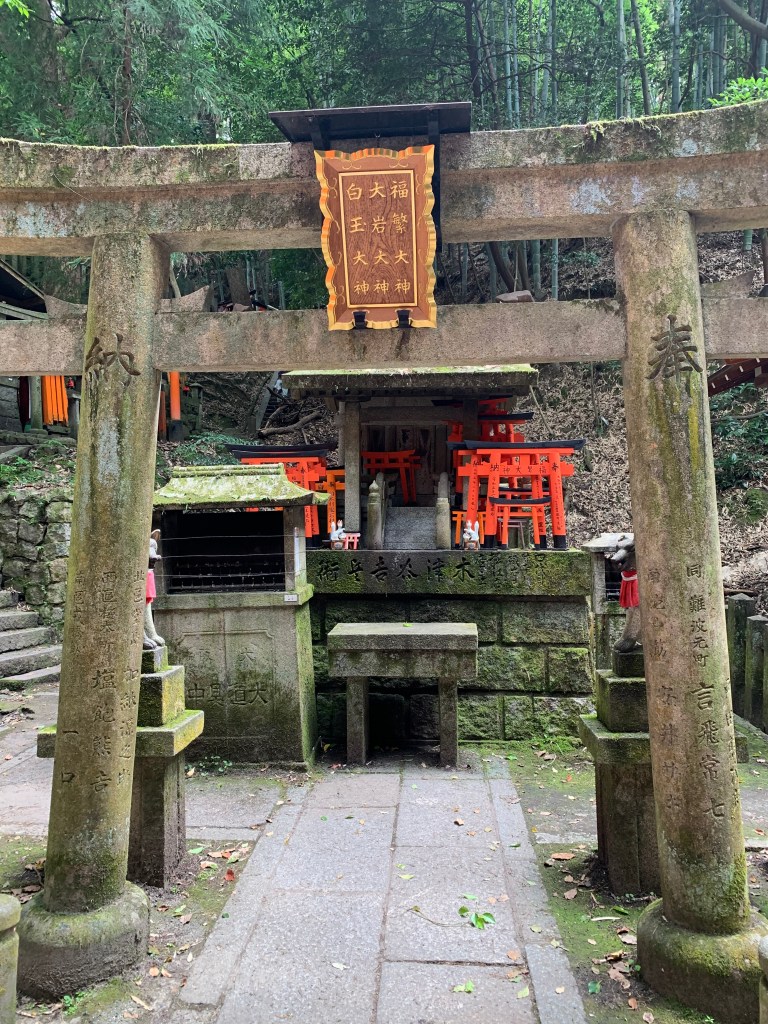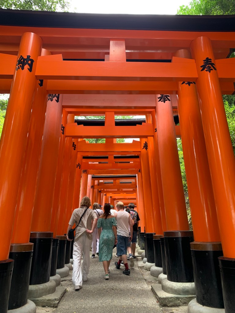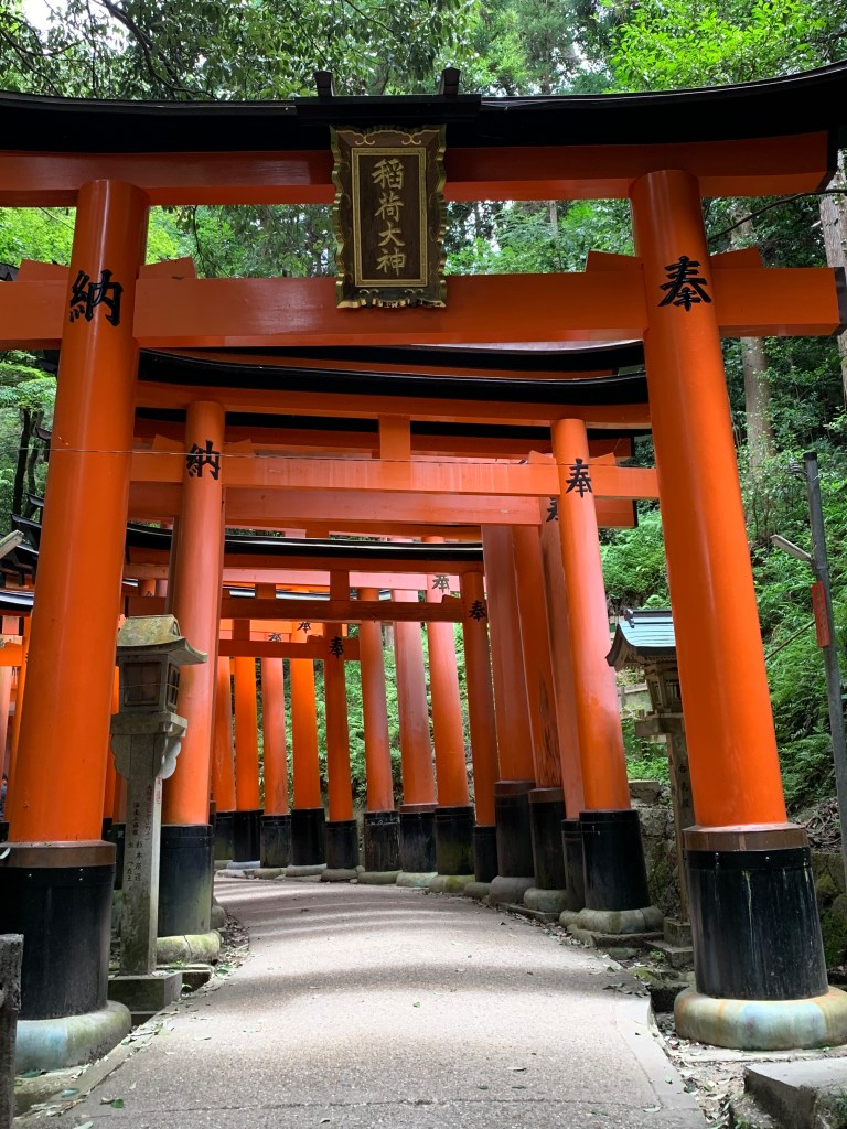 Die Temperatur war ein wenig niedriger als im Stadtzentrum, aber noch weit entfernt vom Zustand ‚angenehm‘ und so wurden es, je weiter wir nach oben kamen, sehr schnell immer weniger Menschen. Als wir nach etwas einer Stunde deutlich kurzatmig (und unter Verbrauch von etwa 3 Wasserflaschen pro Person) den von google als „schönsten Aussichtspunkt entlang der Strecke“ ausgewiesenen Punkt erreicht hatten, waren laut Wegweiser noch etwa 30 Minuten Wegstrecke bis zum Gipfel übrig. Ein kurzer Blick in die verschwitzten Gesichter und wir waren uns ohne große Worte einig, dass uns die Menge an bisher gesehenen Torii und Schreinen angesichts der herrschenden Temperaturen absolut ausreicht und weder der sich am Gipfel befindliche Schrein noch eine eventuelle besondere Aussicht von ganz oben, einen weiteren Aufstieg rechtfertigten. Und so beglückwünschten wir uns, dass wir im Gegensatz zu soooo vielen anderen trotz der widrigen Umstände ja sooo weit nach oben gekommen waren, versicherten uns nochmals, dass das hier definitiv der schönste Aussichtspunkt war, dass wir an religiösen Stätten & Co ja mittlerweile auch schon wirklich viel gesehen hatten und überhaupt war jetzt definitiv der perfekte Zeitpunkt, um umzudrehen – alles ab hier könnte nur noch weniger schön werden. 😀 Unabhängig davon… die Toriis sind schon allein aufgrund ihrer schieren Menge unbedingt einen Ausflug wert. Selbst bei 36 Grad im Schatten.
