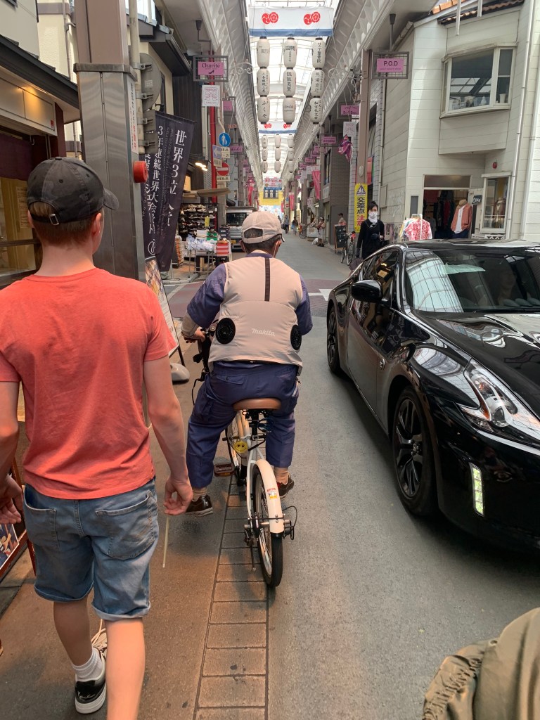 Auch lustig – irgendwie scheint es, gerade bei neueren Geschäften und Restaurants, einen Hang zur Wahl von modern klingenden, englischen Namen für die Shops und Lokale zu geben. Die Sprache selbst spricht dann dort aber niemand. 😀 Oh und dann wollte ich euch doch noch ein Foto von diesen coolen belüfteten Westen zeigen… wir haben uns mehr als einmal auch so eine gewünscht. 🙂