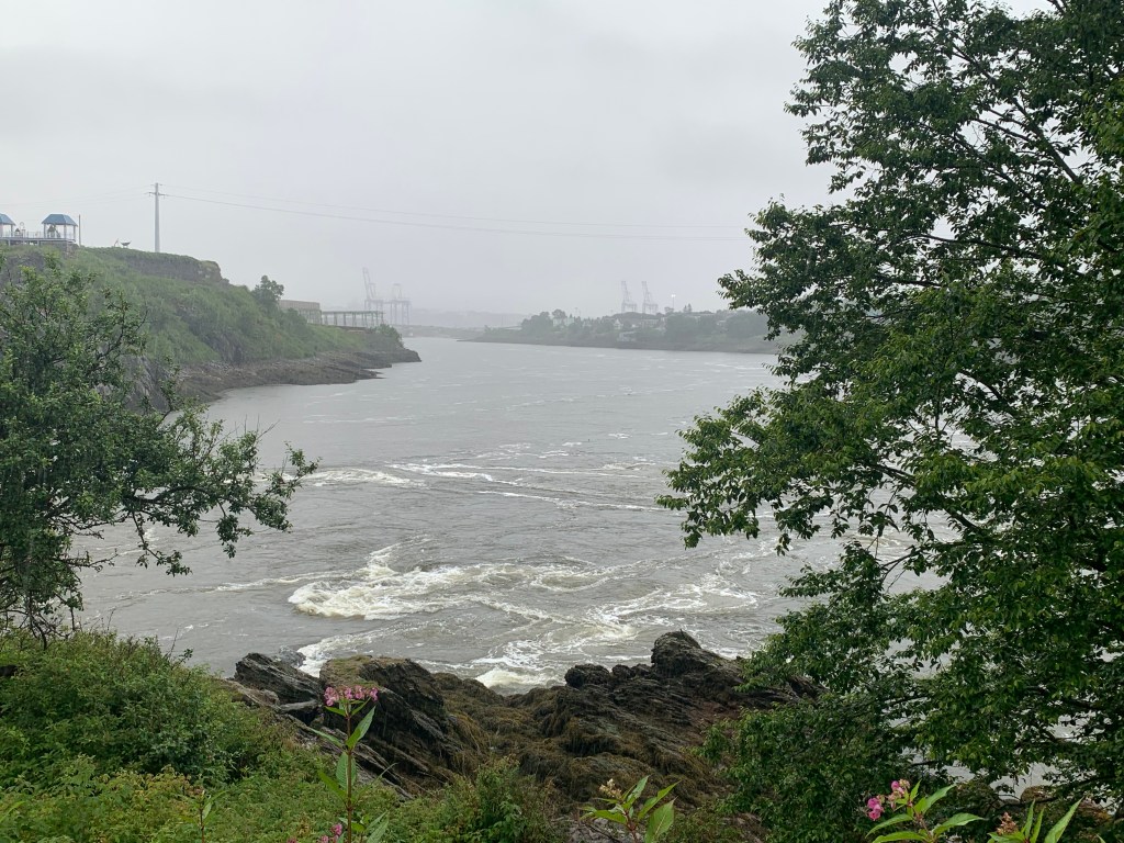Nun scheint aber wettertechnisch in diesem Urlaub (oder hoffentlich nur in diesem ersten Abschnitt) irgendwie der Wurm drin zu sein. Und so begrüßte uns der neue Tag beim Aufwachen mit Starkregen und Gewitter. Ein Blick auf die Wettervorhersage für Saint John verriet, dass es dort ähnlich aussah und für die nächsten Stunden auch nicht mit Besserung zu rechnen war. Also spontan die frühe Abreise durch Ausschlafen und entspanntes Frühstücken ersetzt – eine ausgiebige Stadtbesichtigung würde bei starkem Regen definitiv keinen Spaß machen. Die Fahrt nach Saint John verlief dann aufgrund miserabler Sichtverhältnisse eher gemächlich und so hatten wir auch nur noch etwa 1,5 Stunden bis zur Abfahrt der Fähre. Die Reverse Falls wollte ich mir aber nicht entgehen lassen. Schließlich handelt es sich hier um ein ganz besonderes Naturschauspiel an den Zuflüssen in die Bay of Fundy. Aufgrund der riesigen Wassermassen, die bei Flut aus der Bay in Richtung der Flüsse strömen, entstehen Stromschnellen und Verwirbelungen und an manchen Stellen kehrt sich sogar die Fließrichtung der Flüsse um, so dass das Wasser in diesen Flüssen zeitweise flußaufwärts fließt.