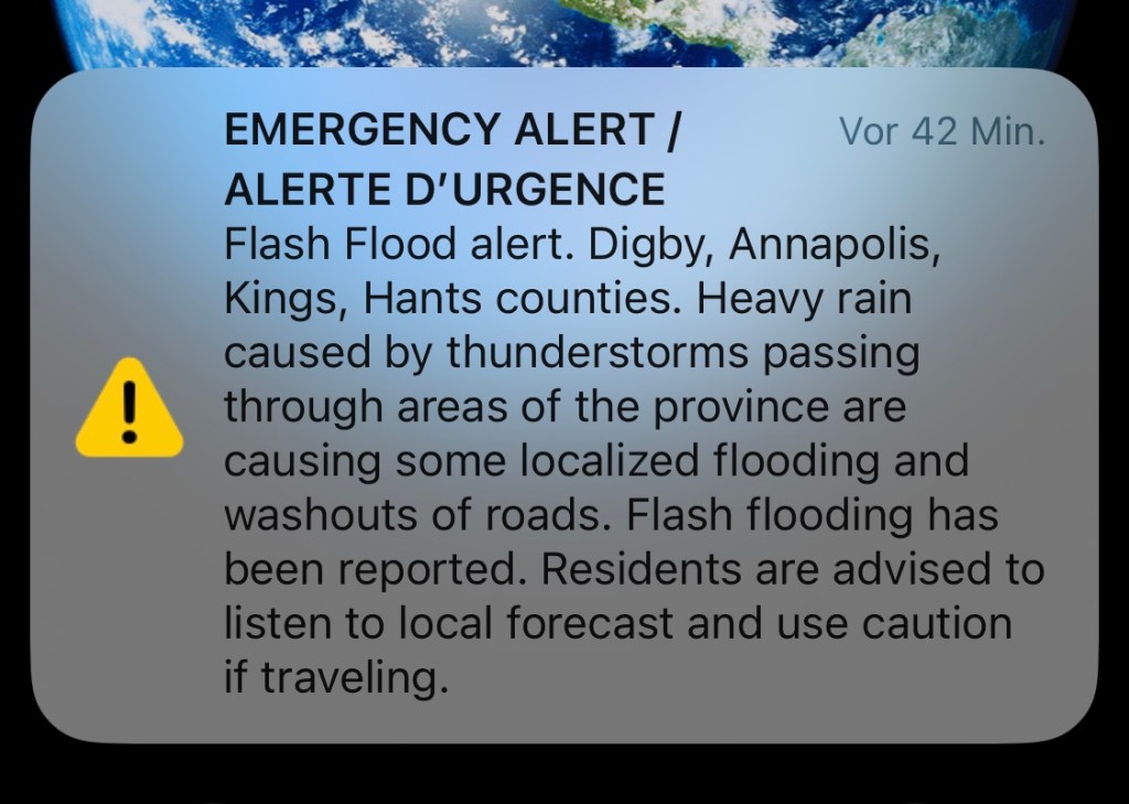 Bei der Ankunft in Digby hatte sich die Unwettersituation nicht verbessert. Im Gegenteil. Kaum dass wir die Fähre verlassen hatten, vibrieren und klingelten sämtliche Mobiltelefone und zeigten alle die gleiche Nachricht: