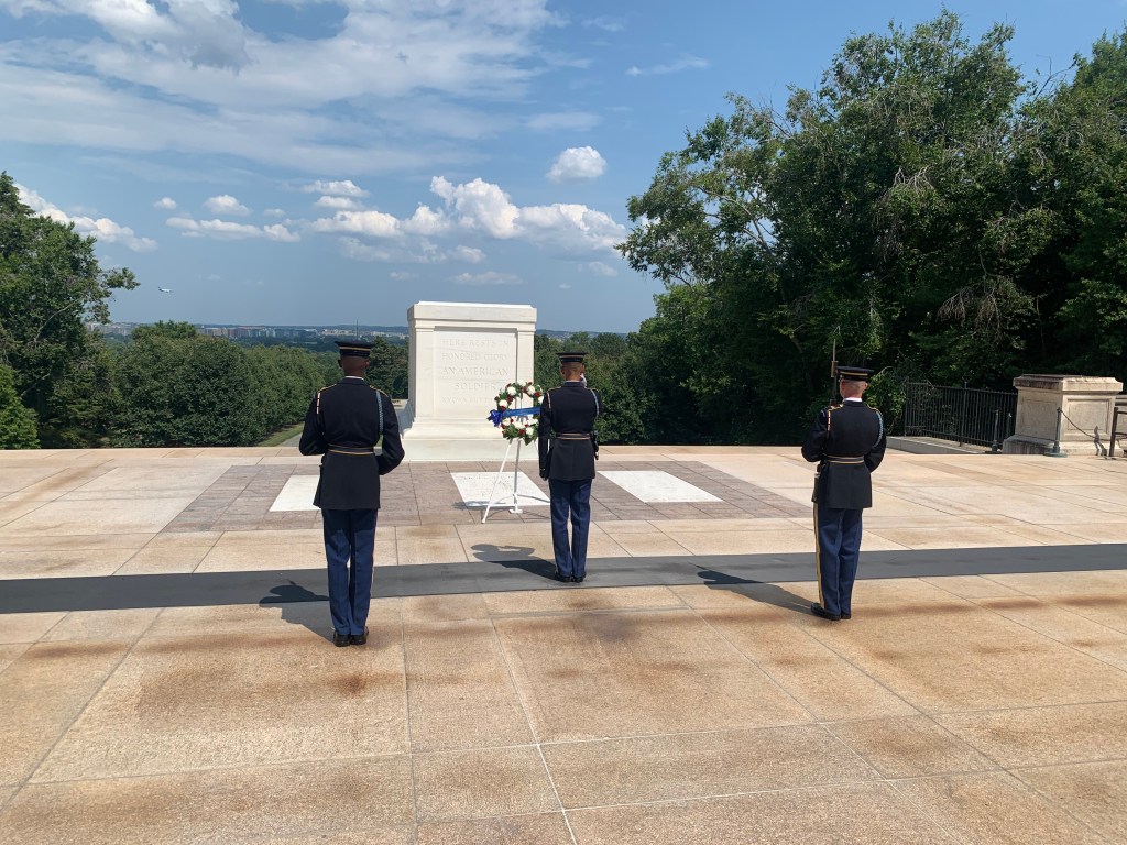 …und zum anderen das „Grab des unbekannten Soldaten“. An diesem steht 24 Stunden am Tag eine Wache, die alle halbe Stunde in einem Zeremonie-ähnlichen Ablauf wechselt. (Zwischen Oktober und April zu jeder vollen Stunde) Während der Wachzeit läuft der Soldat immer genau 21 Schritte vor dem Grabmal entlang, wartet dann und schaut 21 Sekunden nach Osten, anschließend 21 Sekunden nach Norden, lehnt dann das Gewehr an die dem Besucher zugewandte Schulter, um zu zeigen, dass er zwischen dem Grabmal und jeder potenziellen Bedrohung steht und läuft dann wieder exakt 21 Schritte zurück, um die Prozedur wieder von vorn zu beginnen. Die „21“ steht dabei für die höchste militärische Ehrerbietung in Form von 21 Salutschüssen. (Die genaue Beschreibung des Machtwechsels erspare ich euch – nur so viel… es zieht sich ein wenig und die Amerikaner mögen es melodramatisch. ;-))