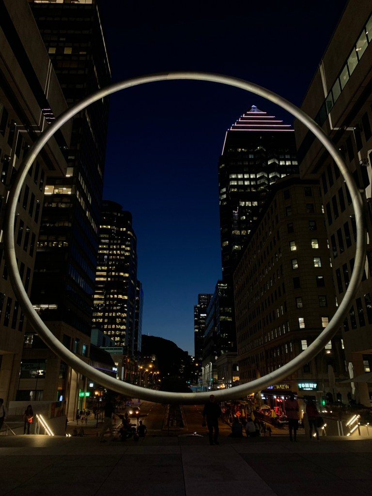 Das Quartier des Spectacles ist das Künstler- und Kulturviertel von Montreal, mit Veranstaltungshallen, Museen und zahlreichen Freiluftausstellungen und -festivals. Eines dieser Festivals fand zufällig auch gleich am Abend unserer (ersten) Ankunft in Montréal statt. Bis spät in die Nacht (wohlgemerkt an einem ’normalen‘ Wochentag ;-)) waren unzählige Menschen auf der Straße, es gab Live-Musik und an vielen verschiedene kleinen Stände wurden die unterschiedlichsten Dinge angeboten. Eine besondere Installation in diesem Teil der Stadt ist „The Ring“ – ein riesiger beleuchteter Metallring, der erst bei Nacht richtig zur Geltung kommt.