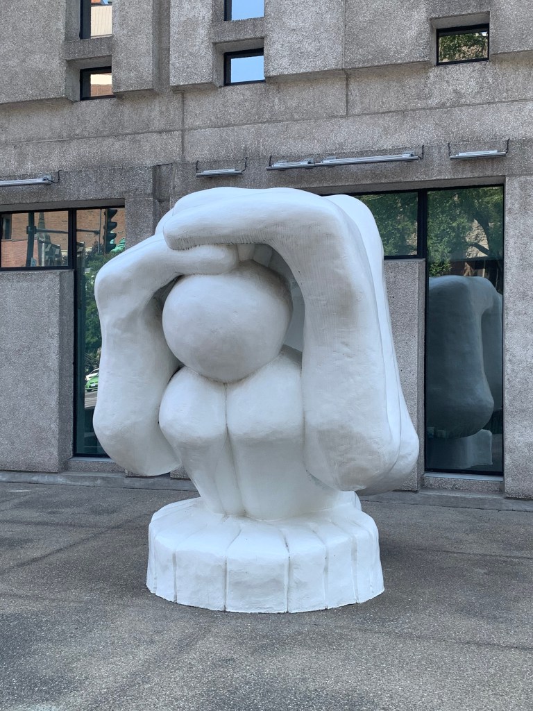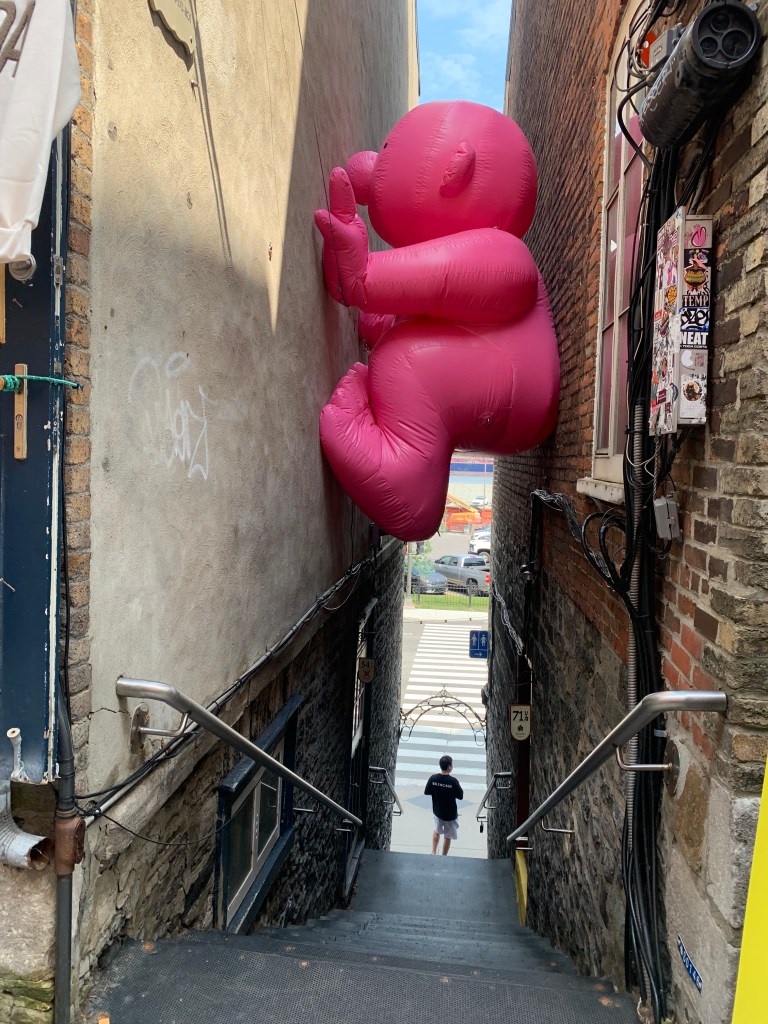 Aktuell gibt es eine ganz besondere Kunstaktion in Montréal: Le Mignonism. Über die Innenstadt verteilt finden sich an den unterschiedlichsten Plätzen insgesamt 15 überdimensionierte pinke Figuren („Mr. Pink). Zufälligerweise hatten wir genau so eine Figur auch in Québec gesehen – ohne zu wissen, was es damit auf sich hat.