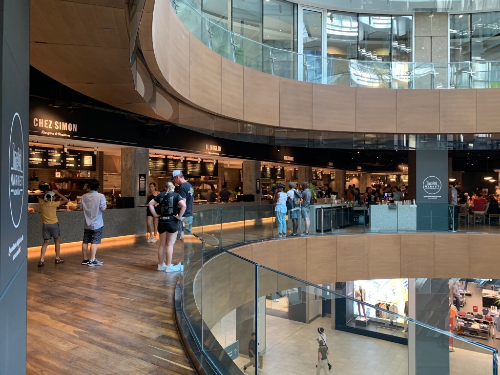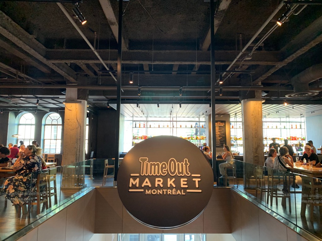 1. Kulinarische Stärkung im „Time Out Foodmarket“. Im Prinzip eine Ansammlung von verschiedenen Restaurants in einem Einkaufszentrum (wie man es von einem „Food Court“ in den großen Malls in Amerika kennt) – allerdings gibt es hier Restaurants aus den unterschiedlichsten Ländern der Welt und es handelt sich nicht um irgendwelche Fastfoodketten, sondern ‚echte‘ Restaurants, in denen das Essen frisch zubereitet wird. Wir konnten uns gar nicht entscheiden, was es für uns sein sollte, so groß war die Auswahl und so lecker sah alles aus. (Übrigens ganz interessant: Die untersten Stockwerke des Einkaufszentrums, in dem sich der Time Out Markt befindet, sind Teil der so genannten Underground City von Montréal – einer riesigen Anlage aus Ladenpassagen und Tunneln, die verschiedenste Orte der Stadt unterirdisch miteinander verbinden. Perfekt, wenn man in einer Stadt, in der die Temperatur im Winter in der Regel deutlich unter 0 Grad fällt, möglichst wenig Zeit draußen in der Kälte verbringen möchte.)