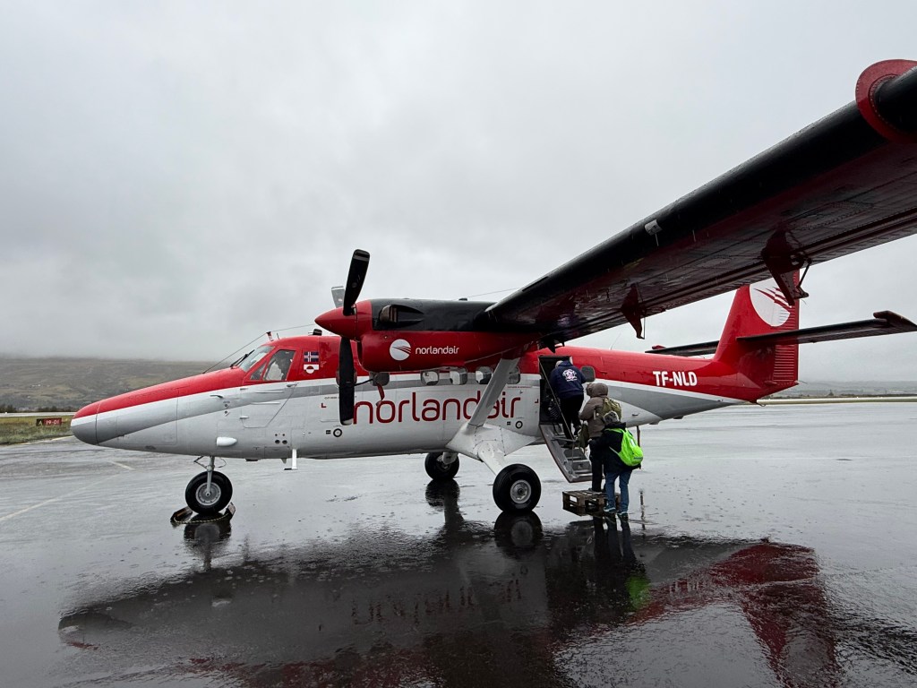 Grímsey kann man von Akureyri aus entweder innerhalb von etwa 3 Stunden mit der Fähre oder alternativ in 25 Minuten mit dem Propellerflugzeug erreichen. Meine Tauglichkeit für kleine Fährschiffe in herausfordernden Wetterbedingungen ist hinlänglich bekannt und außerdem mussten wir ja pünktlich vor dem Ablegen unseres Schiffes wieder zurück sein. Also flogen wir nach Grímsey. Was für ein Erlebnis. 🙂