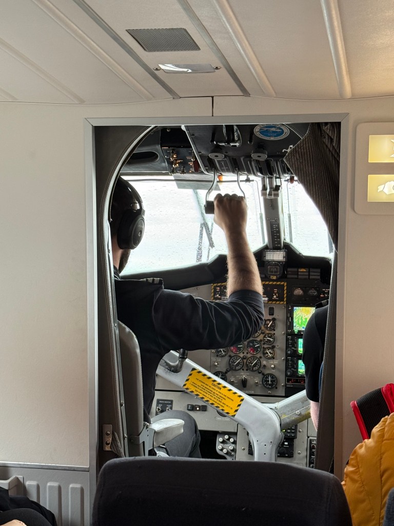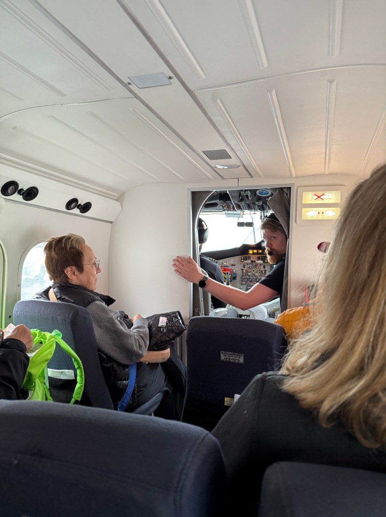 Der Flughafen von Akureyri ist winzig klein. Das Flugzeug ist noch kleiner mit Platz für nur 19 Passagiere. Die beiden Piloten kümmern sich gleichermaßen um das Steuern des Flugzeuges wie um die Sicherheitseinweisungen und um Informationen zur Reise selbst. (Dazu dreht sich der Copilot einfach einmal fix zu den Passagieren um und erzählt die wichtigsten Punkte.) Getränke werden aus irgendeinem Grund auf dem Flug keine gereicht. 😉
