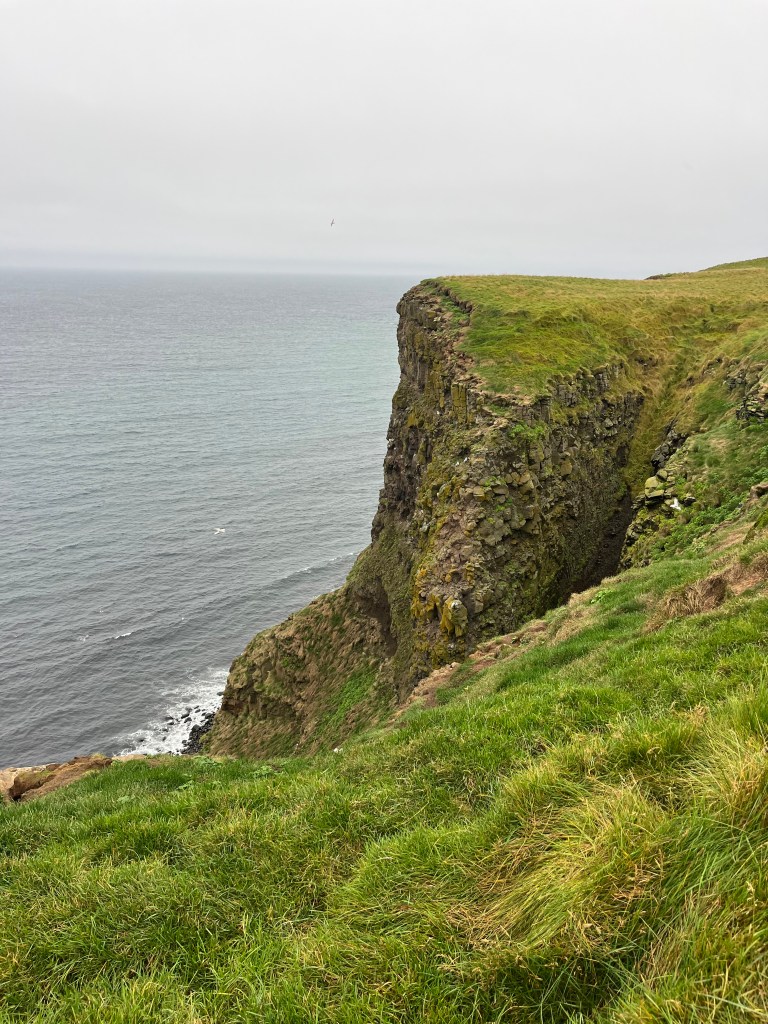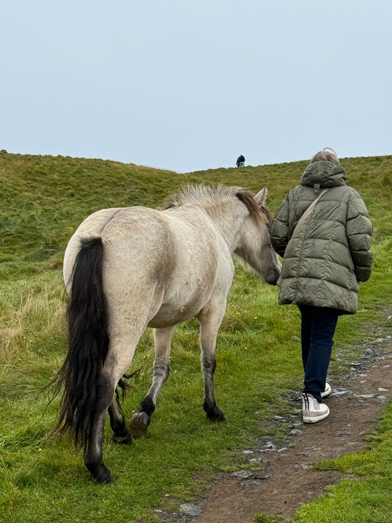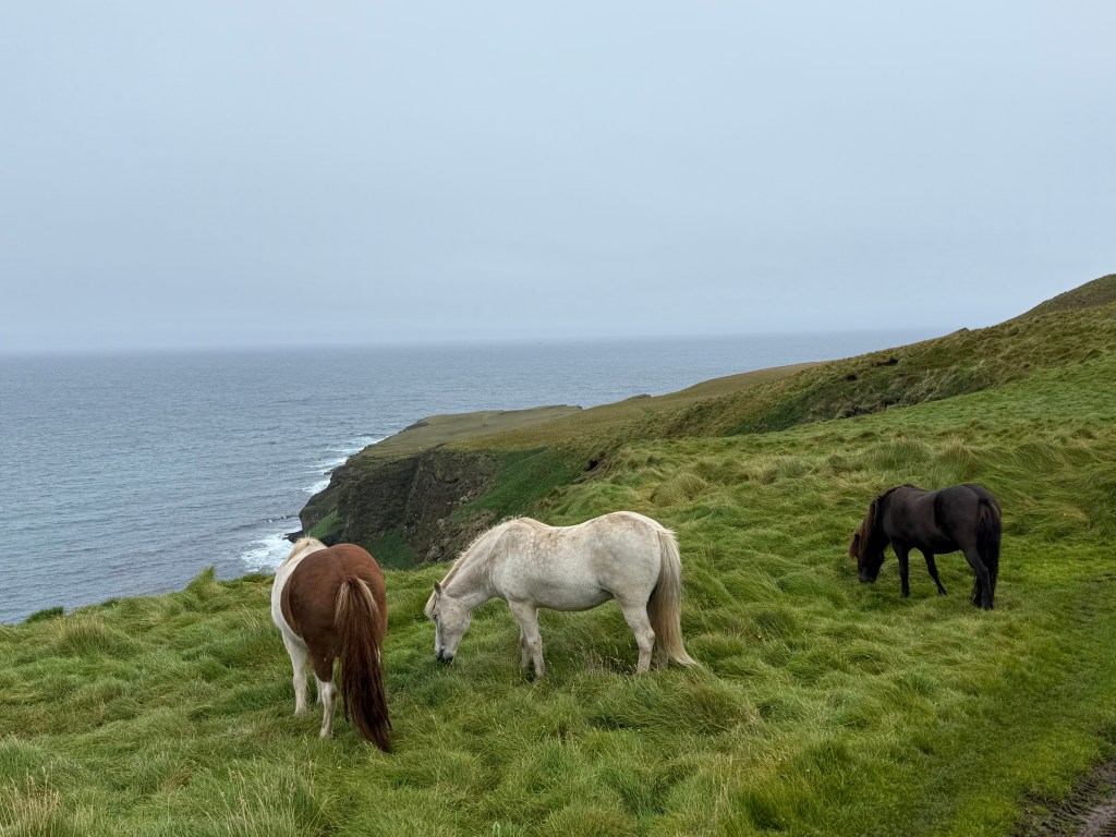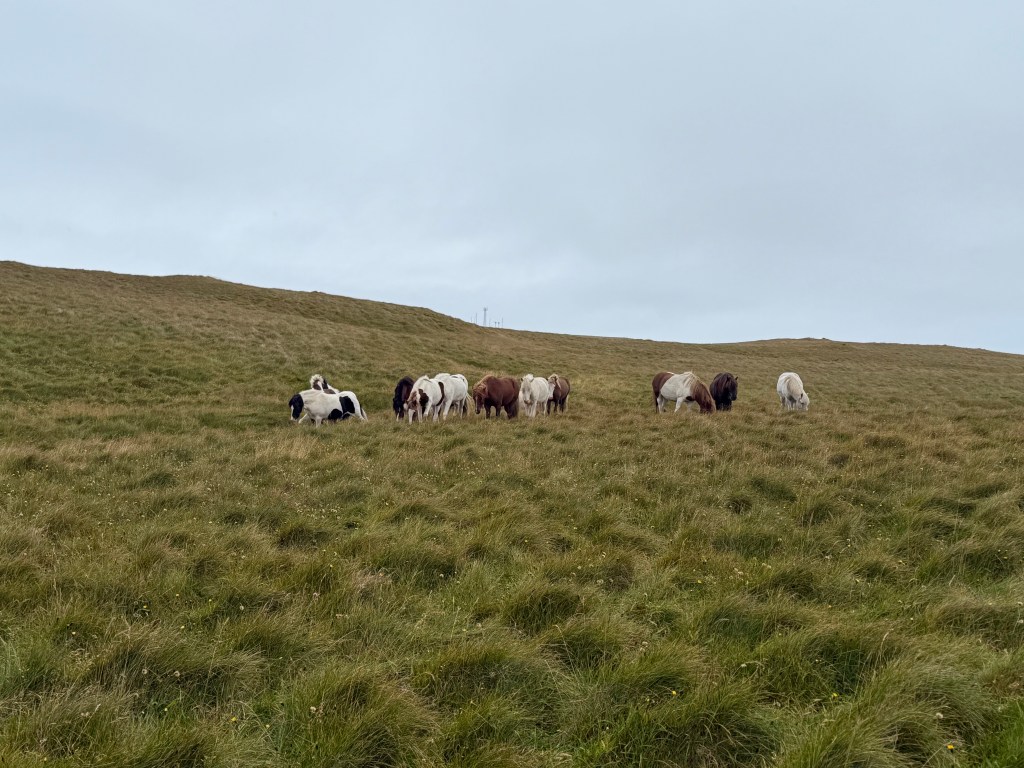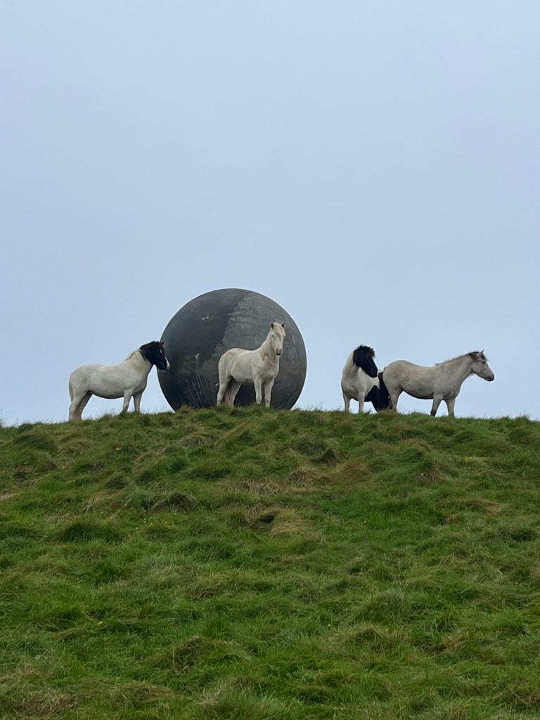 Ein weiteres (ganzjähriges :-)) Highlight der Insel aber ist das Kunstwerk Orbis et Globus – eine riesige Betonkugel, die den Polarkreis markiert und die jedes Jahr zur Sommersonnwende an ihre neue Position gerollt wird. Im Jahr 2047 soll die Kugel schließlich ins Meer gerollt werden. Aber bis dahin kann man sie noch besichtigen. Vom ‚Flughafen‘ aus sind es etwa 45 Minuten zu Fuß auf einem recht befestigten Weg die beeindruckenden Klippen von Grímsey entlang. Und wenn es schon keine Puffins für mich gab, dann doch zumindest eine ganze Herde von Islandpferden, die uns auf dem Weg zur Kugel begegneten und mehr als nur zutraulich waren. Ich denke, da haben wir (und ganz besonders die gute Fee) neue Freunde gefunden. 😀